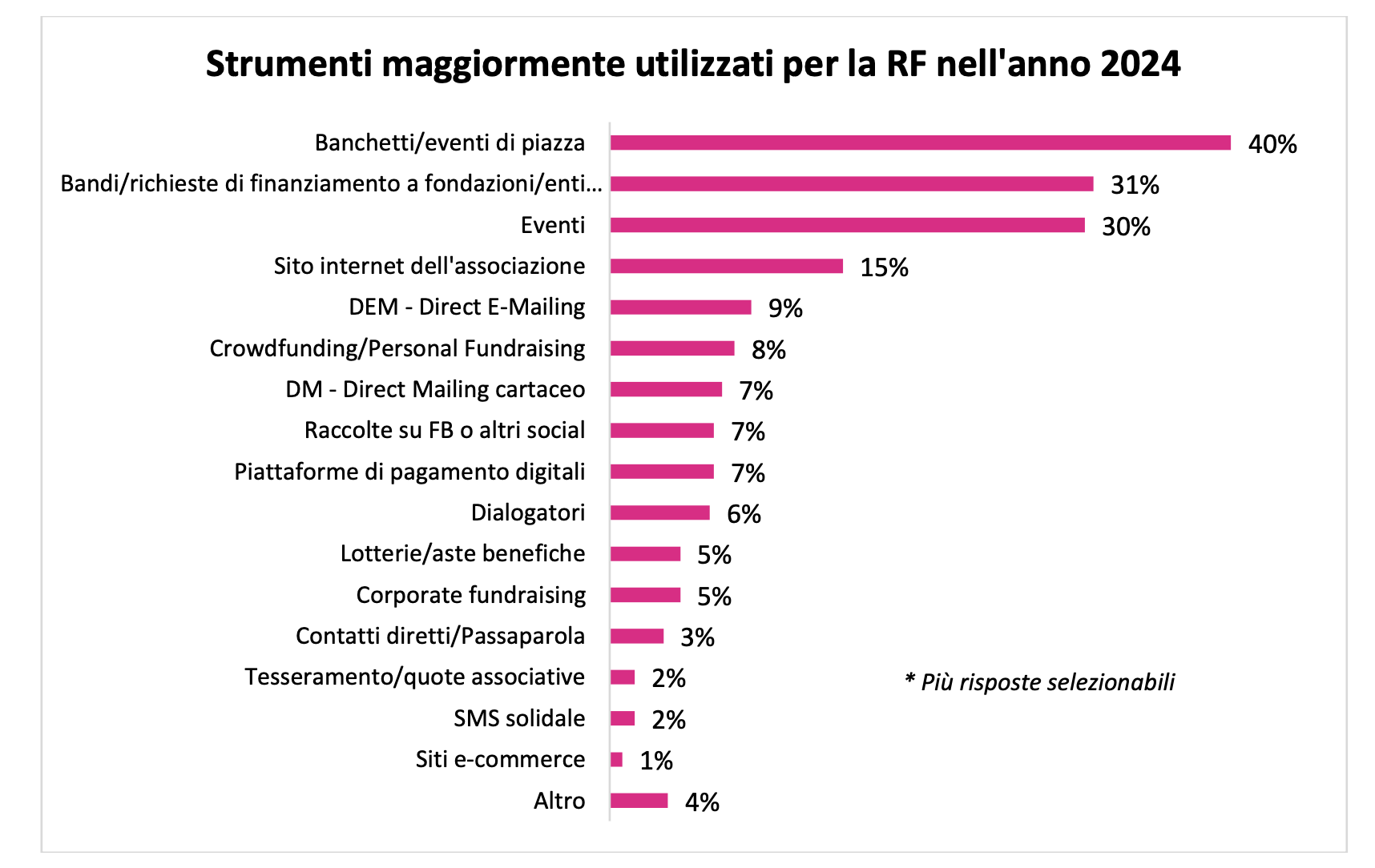 Gli strumenti “tradizionali” restano centrali: banchetti ed eventi di piazza (40%) e bandi (31%).
