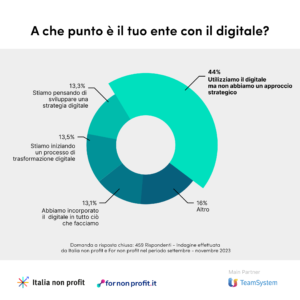 Il tema della digitalizzazione del Terzo Settore italiano ci sta a cuore da sempre: ecco perchè Terzofilo ha aderito alla rete dei partner di diffusione della ricerca “Terzo Settore e Digitale” , realizzata da Italia Nonprofit e For non profit in collaborazione con TeamSystem, che da settembre a novembre 2023 ha raccolto le testimonianze di 459 enti non profit alle prese con il digitale e la tecnologia.